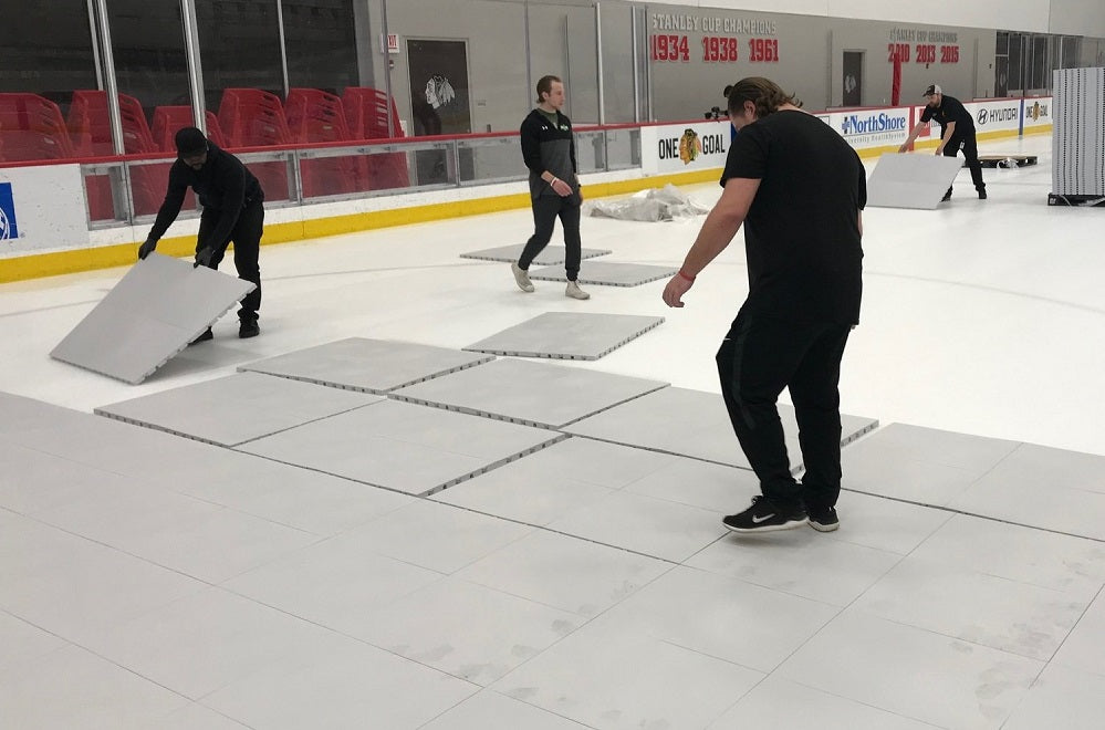 We have 2 types of plastic modular flooring, IceGaurd Lite and teh heavier duty IceGuard Standard which can easily be connected and installed over your ice rink or pad rapidly to provide a hard stable and string floor for any event, show, exhibition or concert.